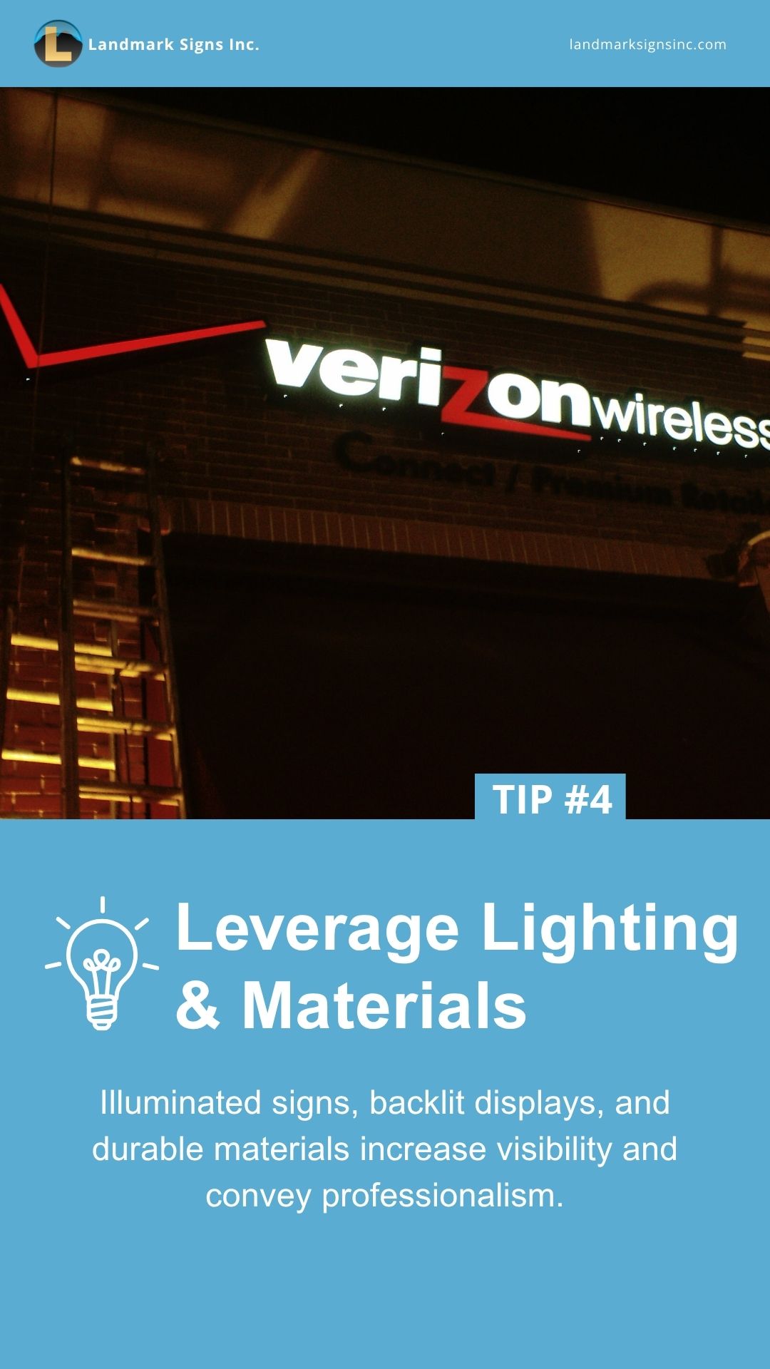 - Leverage Lighting and Materials – Illuminated signs, backlit displays, and durable materials increase visibility and convey professionalism. Well-lit signage attracts attention both day and night, making your store stand out.