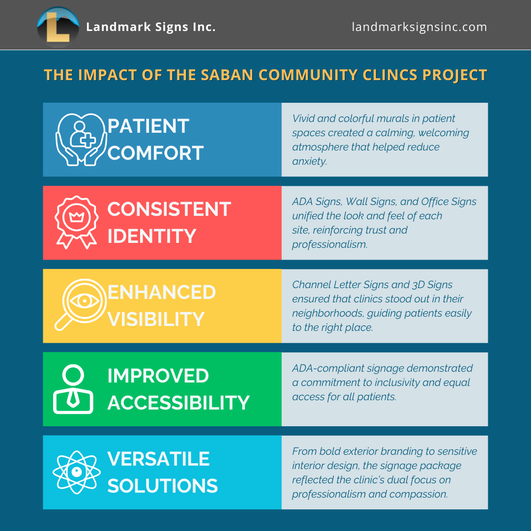 At Saban Community Clinics, Landmark Signs had the privilege of working on a project that went beyond signage—it was about creating spaces where patients felt welcomed and cared for. Across multiple clinic locations, we provided a comprehensive package including ADA Signs, Wall Signs, 3D Signs, Channel Letter Signs, Murals, and Office Signs, all designed to balance functionality with creativity.