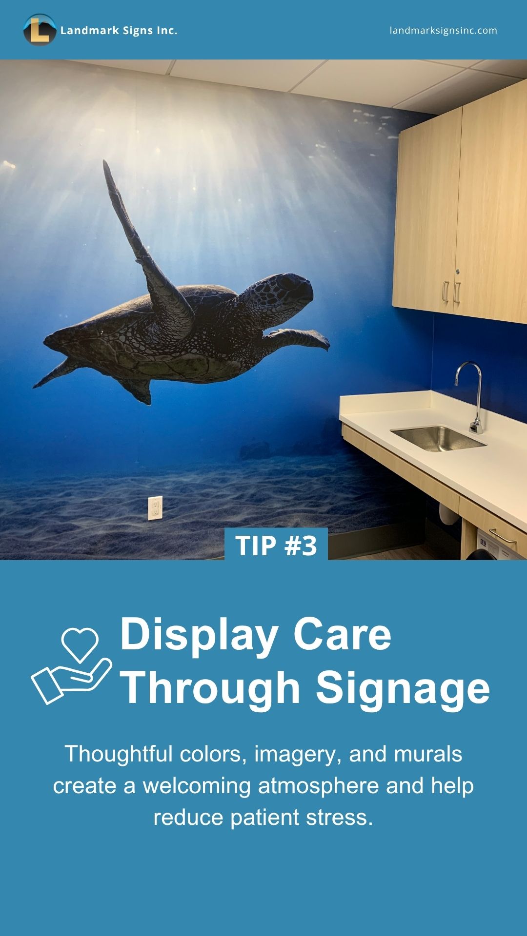 Use signage to care for patients – Colors, imagery, and murals aren’t just decorative. They create a calming, welcoming atmosphere that helps patients feel at ease.